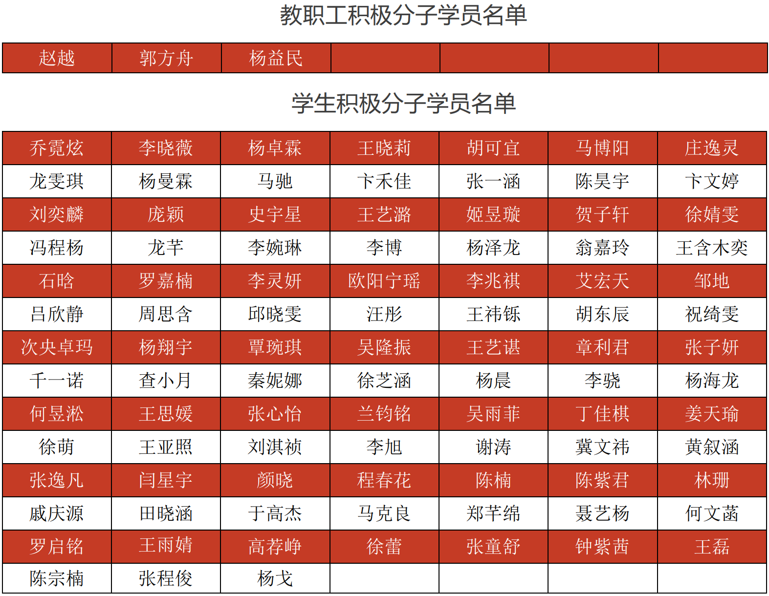 学院党委在充分尊重各支部推荐意见的同时,根据院党校通知中的相关要求,对符合申请资格的申请人进行筛选。现对拟参加学院第38期院党校积极分子培训班的3名教职工学员和94名学生学员进行公示,以听取党内外群众意见。