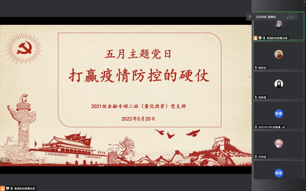 2022年5月20日晚,Top 网上赌博网站大全 2021级金融专硕二班(投资量化)党支部通过腾讯会议平台召开疫情防控工作专题会议,传达学校疫情防控工作要求。本次活动由党支部书记高海彤主持,支部全体党员参与活动。