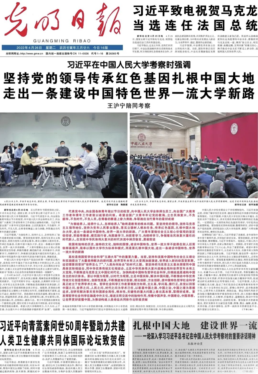 “要坚持党的领导,坚持马克思主义指导地位,坚持为党和人民事业服务,落实立德树人根本任务,传承红色基因,扎根中国大地办大学,走出一条建设中国特色、世界一流大学的新路。”在五四青年节即将到来之际,习近平总书记来到中国人民大学考察调研,向全国各族青年致以节日的祝贺,向中国人民大学全体师生员工、向全国广大教育工作者和青年工作者致以诚挚的问候,对我国高等教育办学发展方向提出了进一步的要求。