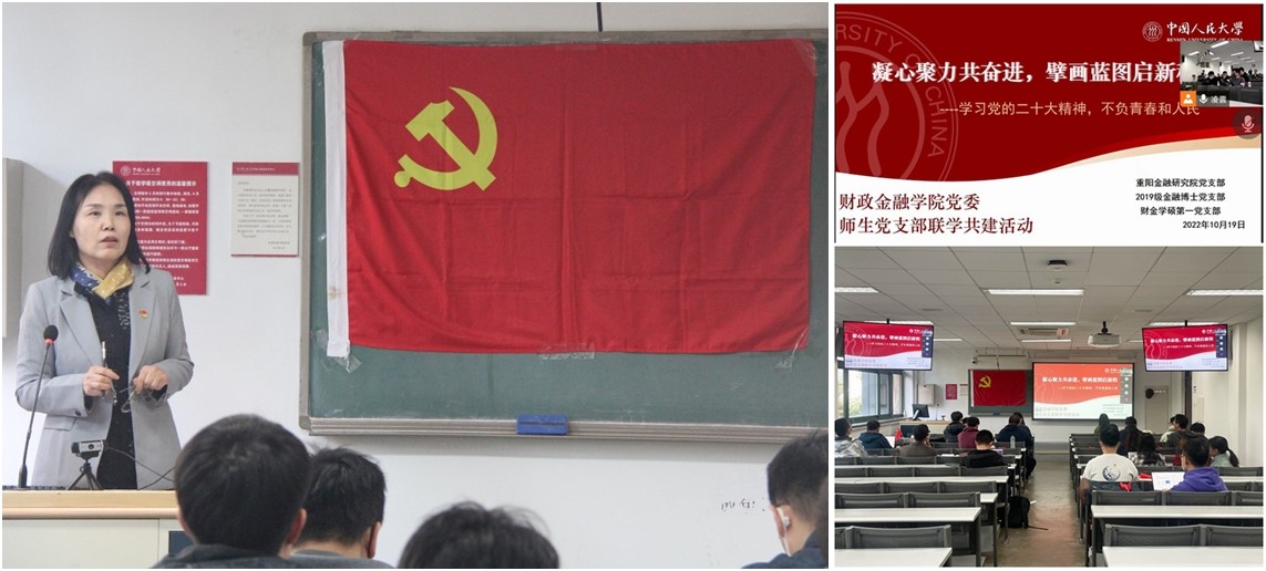 10月19日下午,人大重阳金融研究院党支部、2019级金融博士党支部、学硕第一党支部开展“凝心聚力共奋进,擘画蓝图启新程——学习党的二十大精神,不负青春和人民”联学共建活动。本次活动以线上线下相结合方式开展,线下会场设在公共教学楼3楼3204教室,线上通过腾讯会议平台同步进行。活动由人大重阳金融研究院党支部书记赵锦兰主持,三支部全体党员、入党积极分子参加学习。
