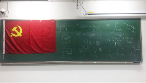 本次理论学习活动以“大国重器——改革开放四十周年”为主题。全体成员观看了与改革开放四十周年有关的视频,对于改革开放的意义以及我国这四十年的发展历程有了更加深刻的理解。观看视频后,党支部全体成员就与改革开放有关的内容进行了“你画我猜”的活动。支部成员依次上台,在黑板上画出了自己对于关键词的理解。蔡耀坤在黑板上画出了一个地球,人们在地球上十指相连,表现出“人类命运共同体”的关键词,他补充道,“我国强调平等互利与共商共建共享,致力于构建人类命运共同体和全球治理思维新模式,极大地推进了世界的发展进程 。”邹琳在黑板上画出了一个骨头,寓意“硬骨头”,她补充道,“贫困问题至今还没解决,要打赢脱贫攻坚战,必须要打碎贫困这块硬骨头”。解祎然所抽到的关键词是“大国担当”,她说道,“中国在对外开放中实现了真正的大国担当,对世界的经济增长作出了巨大贡献,促进了人类的和平与发展”。党支部成员依次上台展示了自己的绘画,并谈了自己对于改革开放的理解。