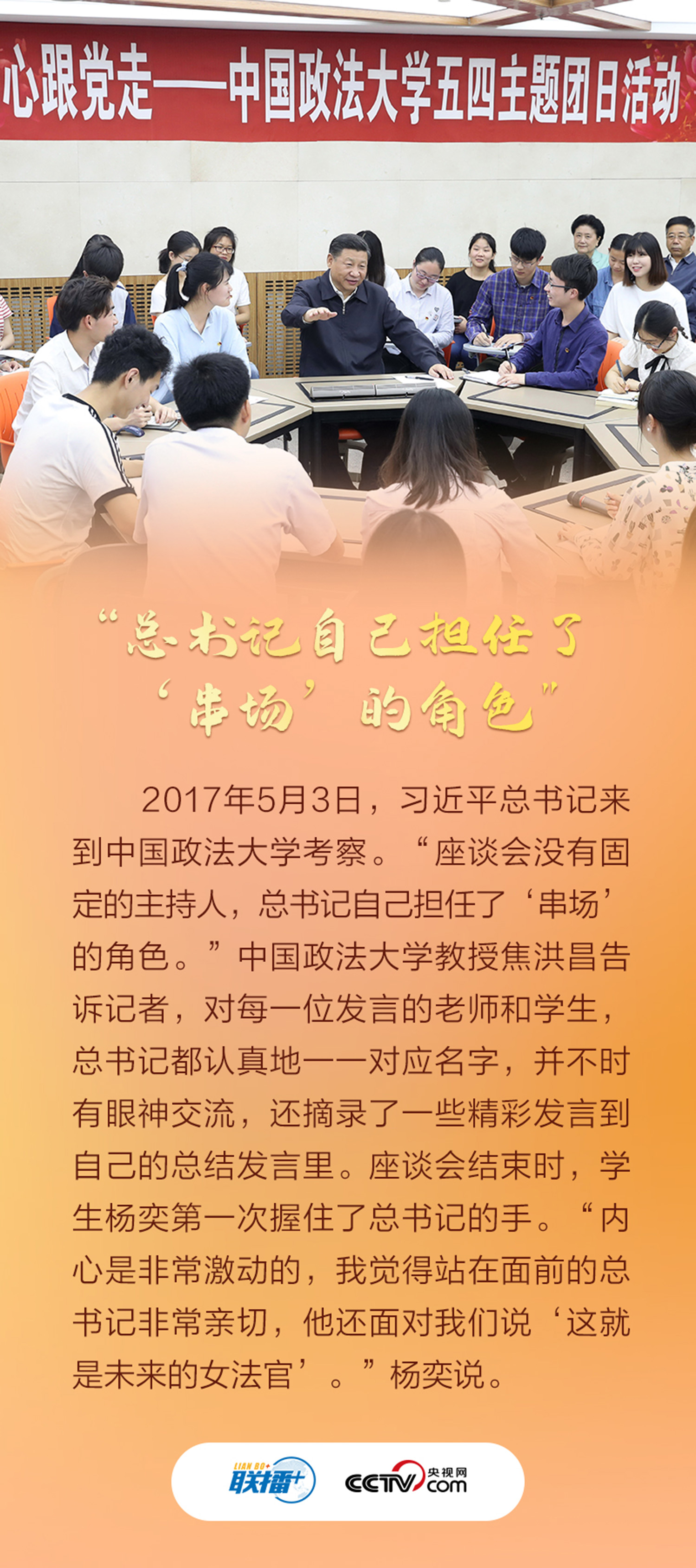 习近平总书记一直心系青年学子,多次来到青年学子中间,聊生活、谈梦想、论志向、说信仰,做青年人前进、追梦路上的领路人。