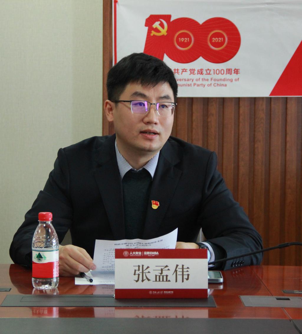 2021级金融EMBA学生临时党支部书记张孟伟作表态发言。张孟伟表示,金融EMBA学生临时党支部的成立,是学院响应广大在职学生党员基本诉求的集中体现,支部各位学生党员深感责任重大,使命光荣。2021级金融EMBA学生临时党支部将努力打造学习型、服务型、创新型支部,推动支部建设和班级建设融合发展,坚持不忘初心、牢记使命,不辜负学校、学院的重托和老师、同学的信任,努力将2021级金融EMBA学生临时党支部党打造成为政治上靠得住、工作上听指挥、学习上抓得紧、活动中有亮点的模范支部。