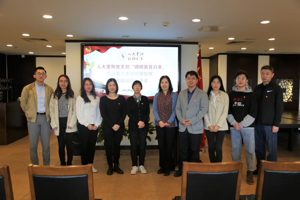 2021年10月14日,中国人民大学重阳金融研究院(人大重阳)党支部组织“调研荣县归来,学习吴玉章等师德楷模”专题组织生活会,就研究院近日组队调研四川荣县,并参观老校长吴玉章陈列馆的感受进行分享。中国人民大学重阳金融研究院党支部全体成员参加本次学习会。