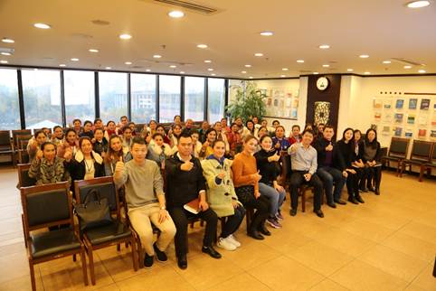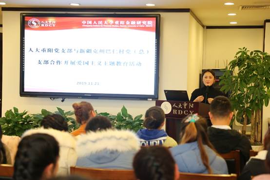 2019年11月21日,在克州党委组织部驻阿克陶县巴仁村“访惠聚”工作队队长、第一书记阿依帕尔·艾斯卡尔的带领下,新疆克州阿克陶县巴仁村爱国主义教育团共39名妇女代表来到中国人民大学重阳金融研究院参观访问,与人大重阳党支部合作开展爱国主义主题教育活动。人大重阳党支部书记、执行院长王文对巴仁村人民的到来表示真诚的感谢以及热烈欢迎,并就爱国主义教育做主题演讲。