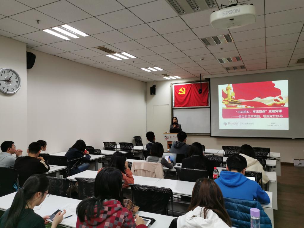 10月31日中午,汉青研究院“不忘初心、牢记使命”主题党课在明德主楼515教室展开。学院党委副书记赵锦兰作“领会新党章精髓,增强党性修养”主题报告。汉青研究院2019级金融专硕一班、二班、三班及硕博连读班党员近40人参加了学习报告。