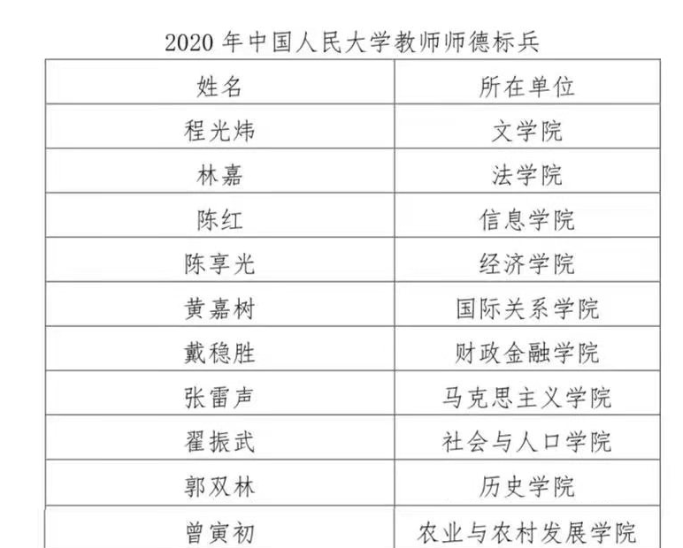 根据《中国人民大学教师师德先进集体、师德标兵评选办法(试行)》,经各单位党组织推荐、评选委员会评审以及公示环节,学校党委共遴选产生了5个“2020年中国人民大学教师师德先进集体”和10名“2020年中国人民大学教师师德标兵”。 中国人民大学教师师德先进集体、师德标兵评选旨在发挥我校师德榜样人物的引领示范作用,在全校进一步营造尊师重教的良好风尚,弘扬新时代我校教师和教师群体执着于教书育人、献身于教育事业的高尚情怀,落实立德树人根本任务。
