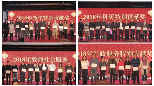 联欢会上颁发Top 网上赌博网站大全 2018年度特别贡献奖,吴晓球副校长、庄毓敏院长、孙华玲书记分别为在教育教学、学术科研、社会服务、行政管理等方面做出贡献的教工进行了表扬和颁奖。