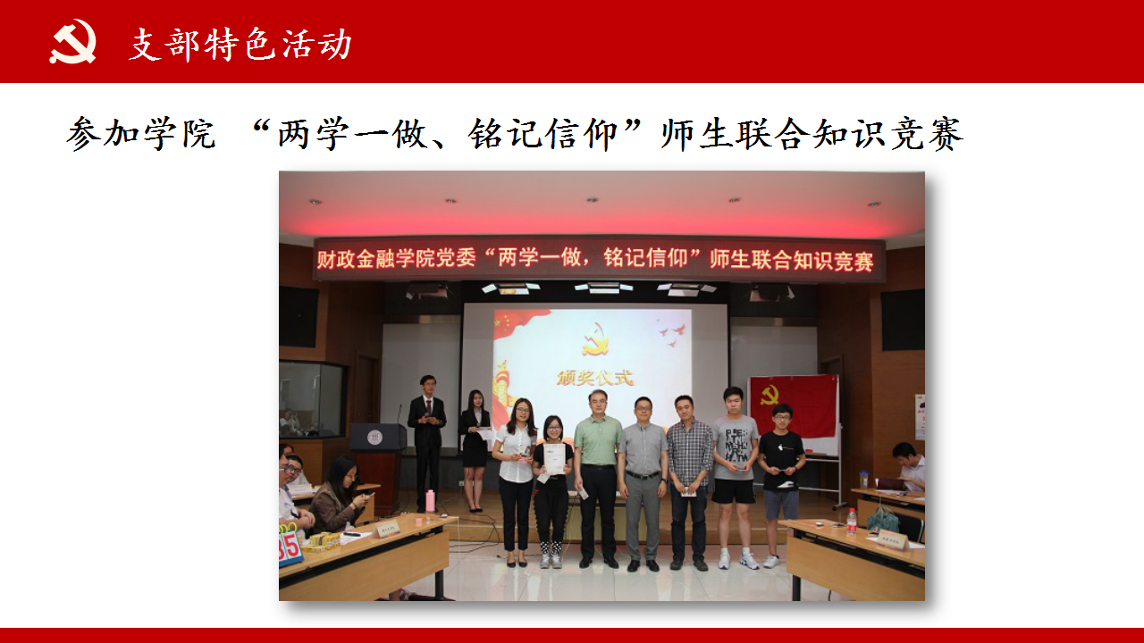 为深入推进“两学一做”学习教育系列活动,货币金融系党支部党员代表参加了学院“两学一做、铭记信仰”师生联合知识竞赛,并获得一等奖,增进了师生间的情谊,发挥了党员的先锋模范作用,让支部党员对习近平总书记提出的“两学一做”有了更深刻的理解,更加坚定了共产主义的理想信念,并对自己提出了更高的要求。