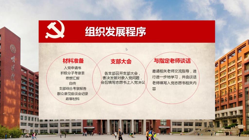 该微党课以入党流程讲解为主,包括从递交入党申请书到成为正式党员的主要步骤,并涉及各个阶段的材料准备工作。制作过程中,各支部成员积极参演,生动地再现了成为一名光荣共产党员的全过程。该微党课为有入党意愿或正在入党过程中的学生提供服务,满足其了解入党流程的需求,为在学生中广泛吸纳新党员、为党组织灌入新鲜血液做好了宣传与准备工作。