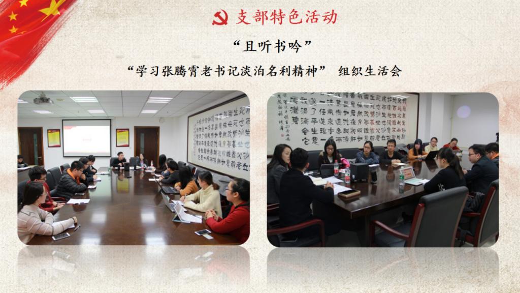 “且听书吟”是2014级本科第四党支部线下理论学习的一项代表性创新。参考央视的《朗读者》节目,通过多种形式的朗诵方式诵读党章及党的相关理论和人物先进事迹,讨论交流心得,在聆听中思考,在朗读中升华,加深理论学习印象。支部曾以“学习张腾霄老书记淡泊名利精神”为主题召开组织生活会,荣获“组织生活标兵支部”称号。
