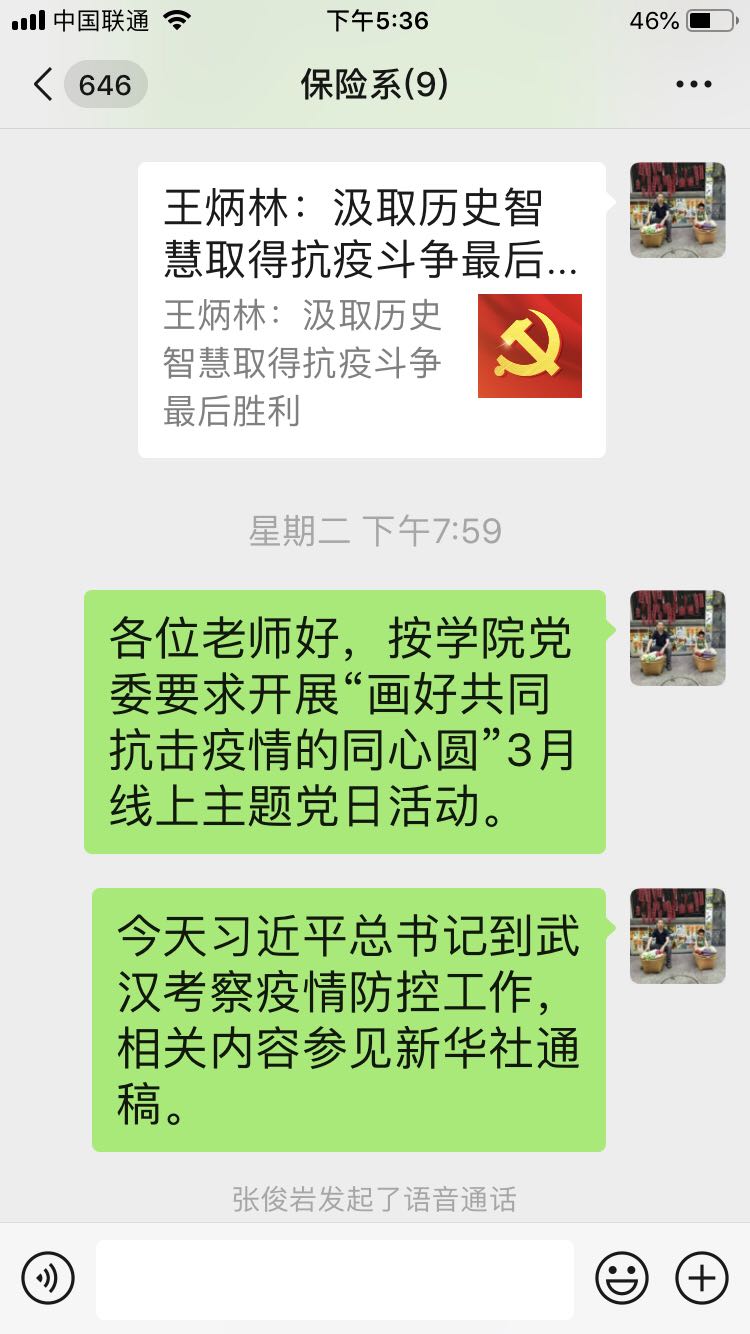 根据学院党委统一要求,Top 网上赌博网站大全 保险系党支部于2020年3月10日晚上组织开展“画好共同抗击疫情的同心圆”线上主题党日活动。经过支委会讨论,此次活动以观看疫情防控思政课和讨论党员教师结合疫情防控筹备系列公益课程为主题。