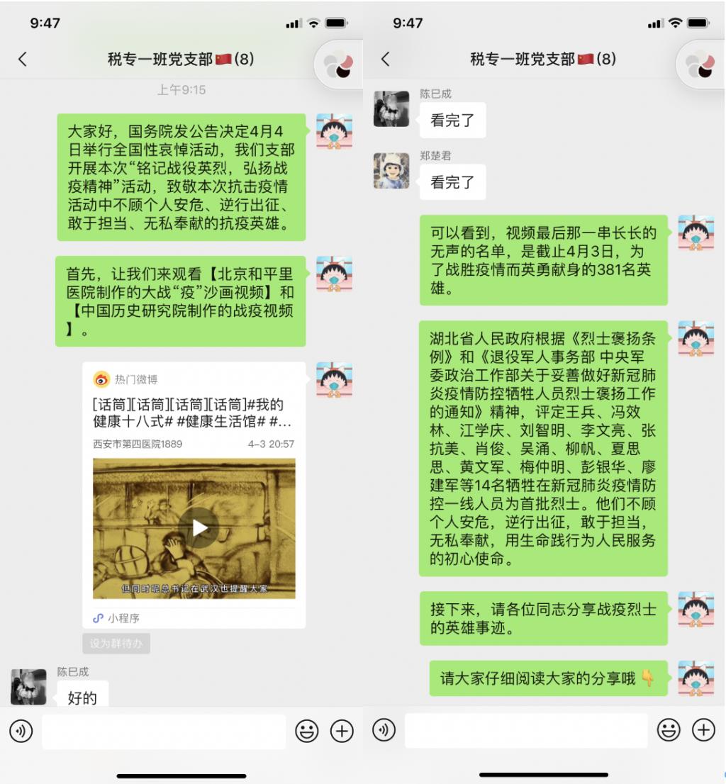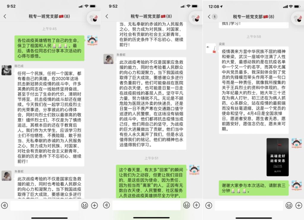 2020年4月4日是全国哀悼日。为纪念在抗疫中牺牲的烈士和逝去的同胞,致敬战疫中不顾个人安危、逆行出征、敢于担当、无私奉献的抗疫英雄,Top 网上赌博网站大全 2019级税务专硕一班党支部在微信群举办了“铭记战疫英烈,弘扬战疫精神”支部活动。本次活动由党支书冯欣然同志主持,支部全体成员。