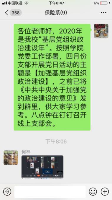 根据学院党委统一部署,保险系教师党支部于2020年4月17日晚组织开展“加强基层党组织政治建设”线上主题党日活动。经过支委会讨论,此次活动以学习《中共中央关于加强党的政治建设的意见》为主题。