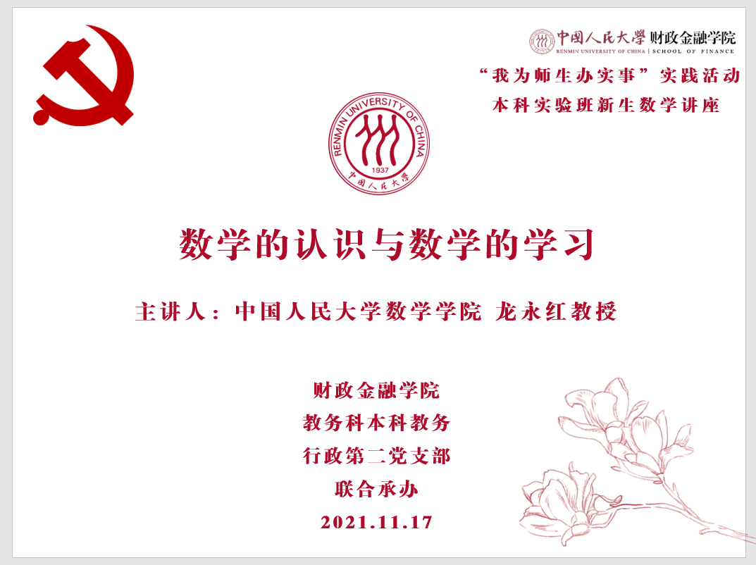 2021年11月17日下午,Top 网上赌博网站大全 “我为师生办实事”实践活动之“本科实验班新生数学讲座”在公共教学楼三楼3201教室顺利举办。本次讲座由Top 网上赌博网站大全 主办,学院教务科本科教务与行政第二党支部联合承办。活动邀请中国人民大学研究生院副院长、数学学院龙永红教授为2021级本科“财政数学”、“金融数学”和“金融科技”三个实验班新生作“数学的认识与数学的学习”专题讲座。实验班班主任代表、2021级本科金融科技实验班班主任邱志刚老师、学院教务科本科教务和行政第二党支部部分党员同志参与讲座。