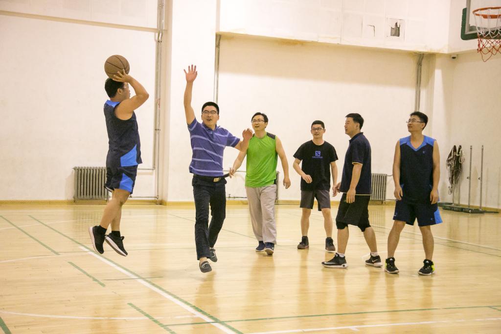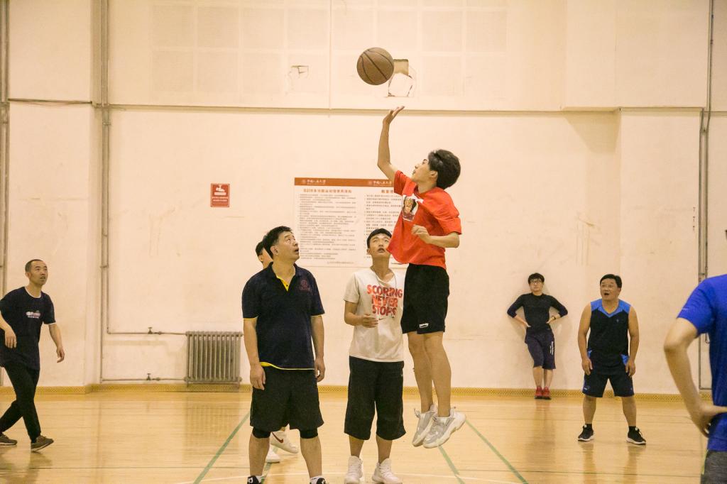 尽管比赛在傍晚开始,劳累一天的师生们依然劲头十足。随着裁判一声哨响,两组的球员同时开战。A组梁鼎同学率先取得控球权,一记漂亮的投篮为学生队拿下了第一分。老师队不甘示弱,黄文彬老师大喊一声,成功从学生手中断球成功,转身、防守、传球,通过几个连贯的动作,成功将球传给齐飞老师。齐老师占据有利地形,高高跳起避开王庆硕同学的防守,中距离投篮成功为老师队赢得一分。学生队体力好、灵活性强;老师队则配合默契、经验丰富。一时间,双方比分焦灼,难分胜负。终于在比赛的第25分钟,凭借王庆硕同学高超的断球技术和梁鼎同学精准的投篮,学生队以微弱领先优势结束了第一局的比赛。