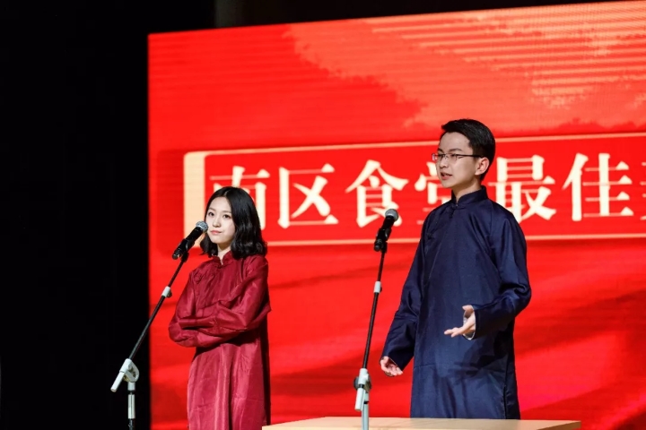 在第一个环节“先声夺人”中,Top 网上赌博网站大全 曹洋铭同学搭档新闻学院选手郭忆馨以南区食堂为主题采取对口相声的形式进行主持和表演。在猪蹄与烤鱼哪个更美味的一来一往对话中,他的语调活泼多变,动作自然,与搭档配合默契,收放自如的台风体现了他深厚的主持功底。