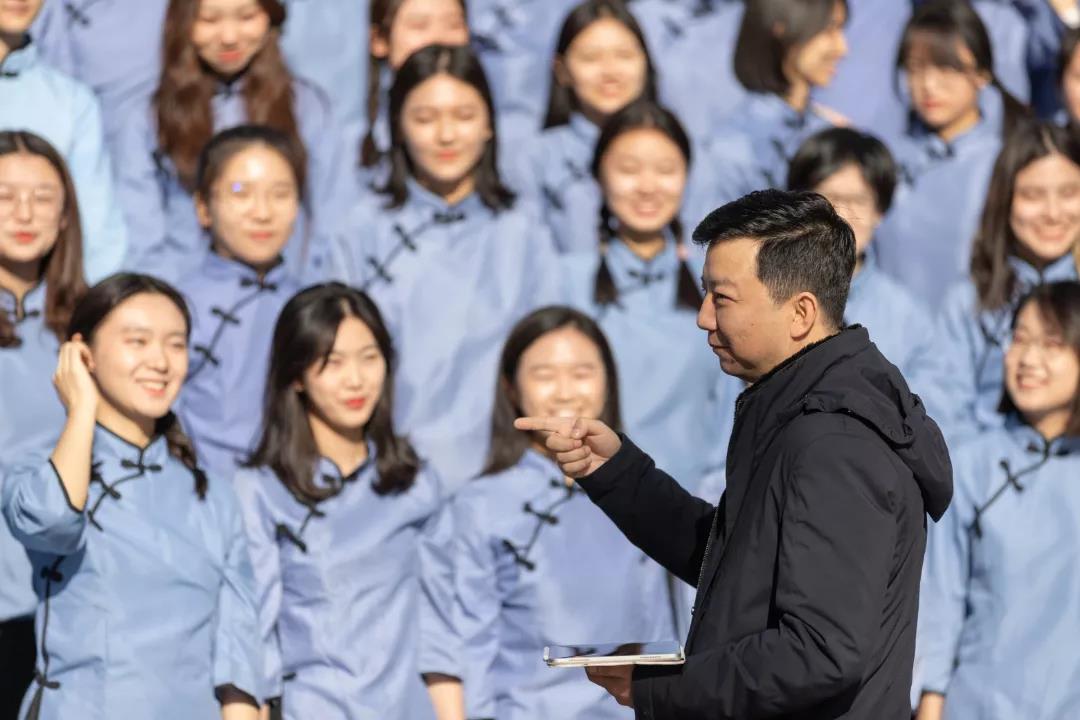 上午十点,合唱队员们身着民国时期的服装,穿戴整齐地来到博物馆门前。整理好发型和着装,调整好站位后,队员们在指导老师王磊的指挥下进行试唱,每一位队员都精神饱满,努力以最佳状态投入到演唱之中。