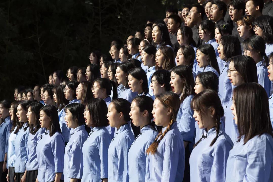 进入正式录制环节,合唱队员们站在博物馆前唱响《陕北公学校歌》。饱满的情绪调动着大家的演唱热情,歌声时而沉稳有力,时而慷慨激昂。歌声中,合唱队员们跨越历史,踏上那条奔赴延安的青春征途,成为克服重重困难,投身民族解放事业的热血青年。“民族的命运全担在我们双肩”彰显着人大学子的责任感、使命感,“战斗的学习”“抗战的骨干”更衬托出当时条件的艰辛与青年们战斗的热情。一句句歌词仿佛带领财金学子亲眼见证了抗战烽火中陕北公学艰苦创业的故事,曲调愈发高亢,情感也越发充沛,昭示着新一代人大青年的报国之志和始终奋进在时代前列的责任担当。
