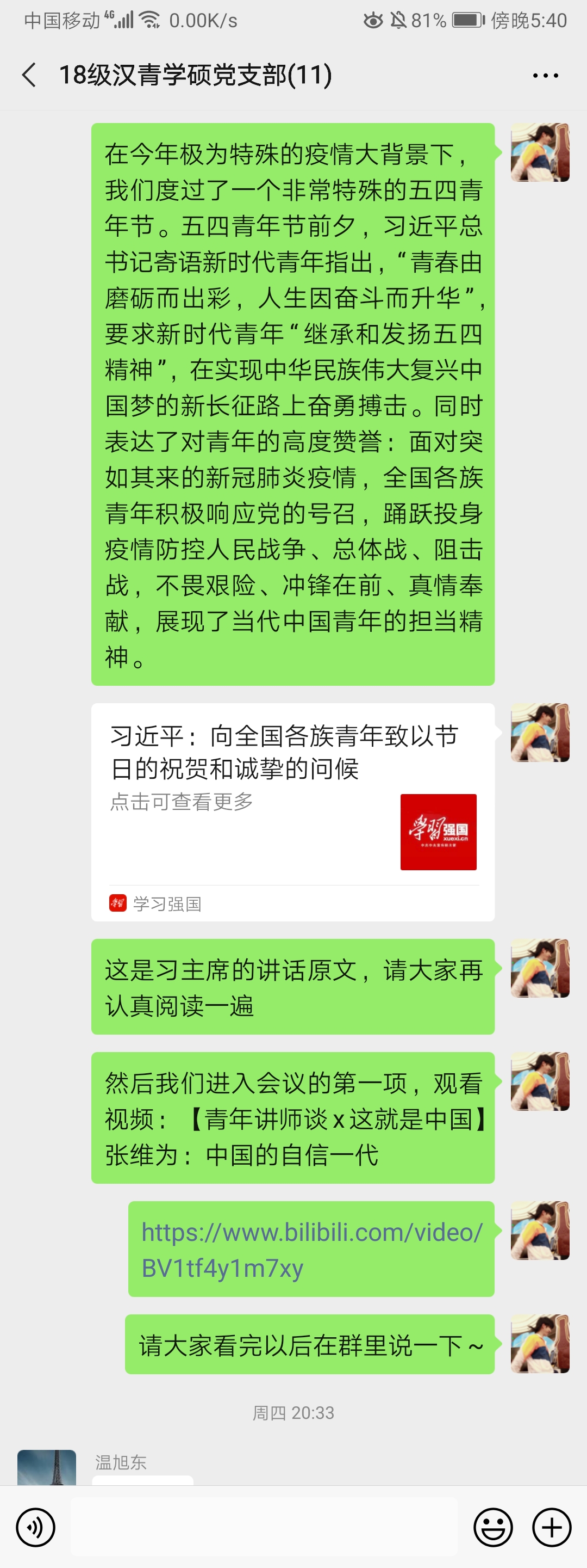 2020年5月14日晚20:00,2018级汉青学硕党支部5月主题党日以线上形式顺利召开。本次线上主题党日的主题是“弘扬五四精神”。支部内8名正式党员、1名预备党员出席,本次会议由本支部书记李梦祎主持。