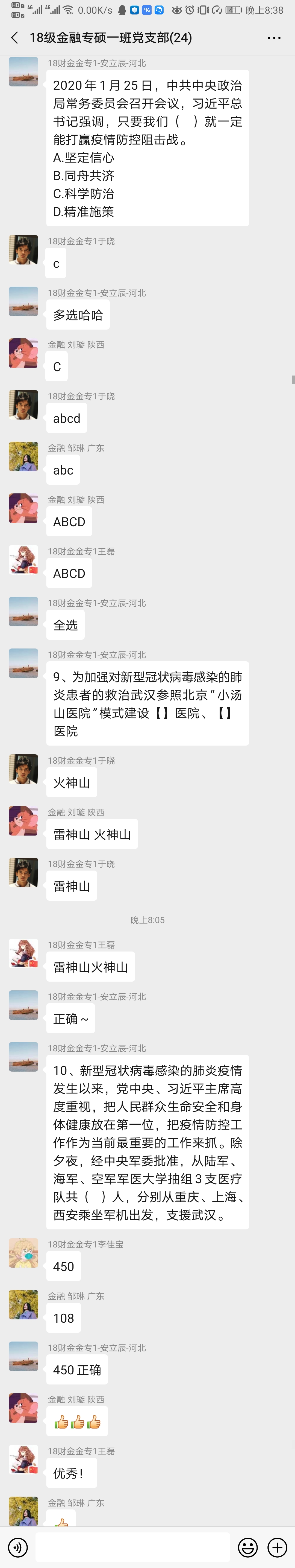 2月9日晚19时,2018级金融专硕一班党支部组织召开“抗击疫情,党员先行”线上主题党日活动。在疫情面前,支部党员们纷纷响应党中央“少聚集”的号召,在家中借助微信平台举办主题党日活动,全体支部成员均准时参加。