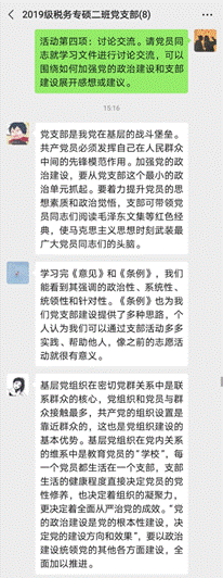 2020年4月15日下午3点,2019级税务专硕二班党支部通过微信群开展了以“加强政治建设,规范组织生活”为题的4月线上主题党日活动。此次活动由党支部书记马国焕同志主持召开。会议深入贯彻落实习近平新时代中国特色社会主义思想和党的十九大精神,以重温入党誓词、学习指导文件为主体,就“加强党和支部的政治建设”展开讨论交流。
