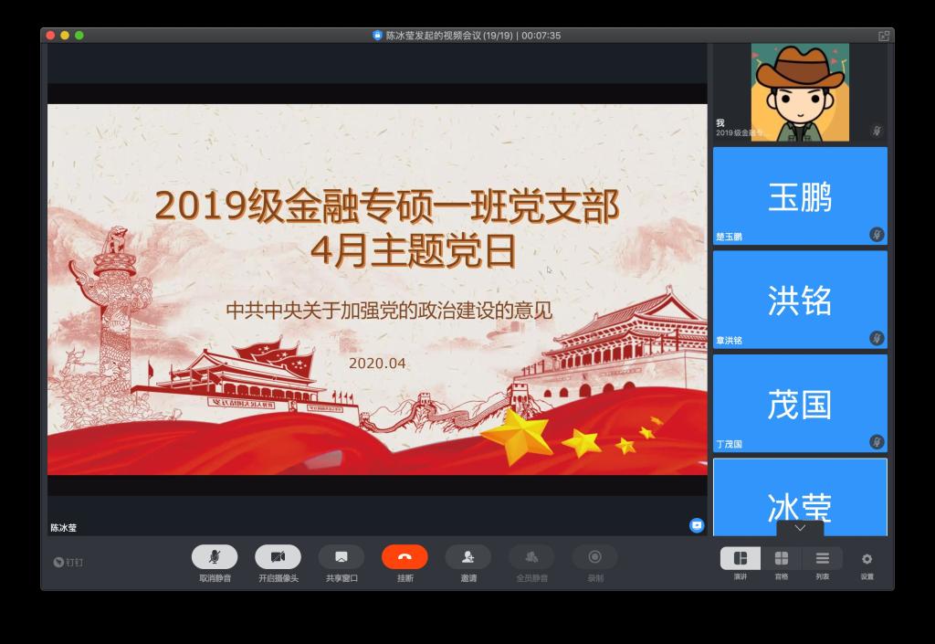 2020年4月16日晚八点半,2019级金融专硕一班党支部通过钉钉线上平台召开了以“加强基层党组织政治建设”为主题的线上主题党日活动。本次会议由党支部书记陈冰莹主持,学院党委委员、支部“一联系一帮扶”指导教师刚健华出席活动并讲话。