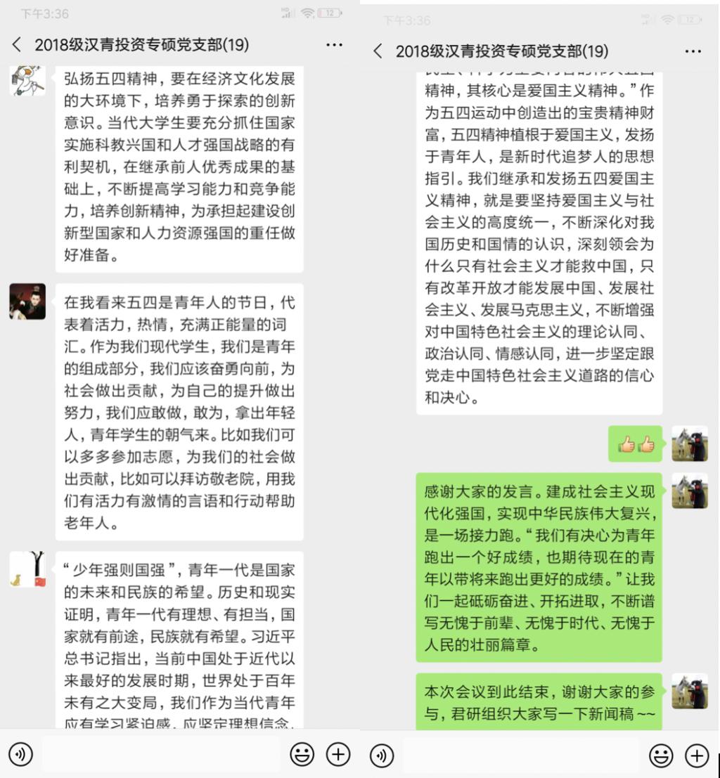 2020年5月16日晚八点,2018级汉青投资专硕党支部全体成员于线上召开弘扬五四精神主题会议,本次会议由支部书记马申娟同志主持。
