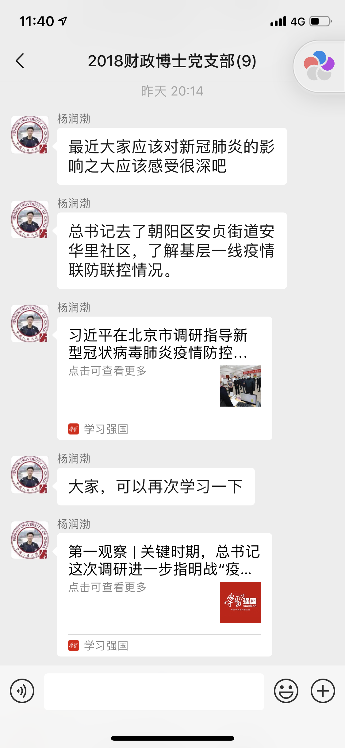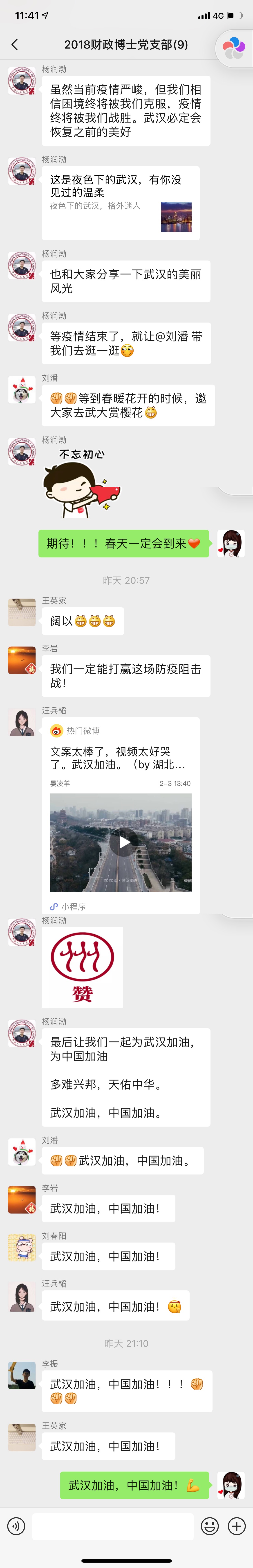 在当前防控疫情背景下,为继续促进党员的进步和学习,更好地发挥基层党支部的战斗堡垒作用,2018级财政博士党支部积极响应学校号召,以线上学习的形式开启了2020年春季学期第一次主题党日活动。本次当日活动以“抗击疫情,党员先行”为主题,于2020年2月12日晚在微信群正式开始,会议由杨润渤书记主持,党支部全体9位同志积极参与。