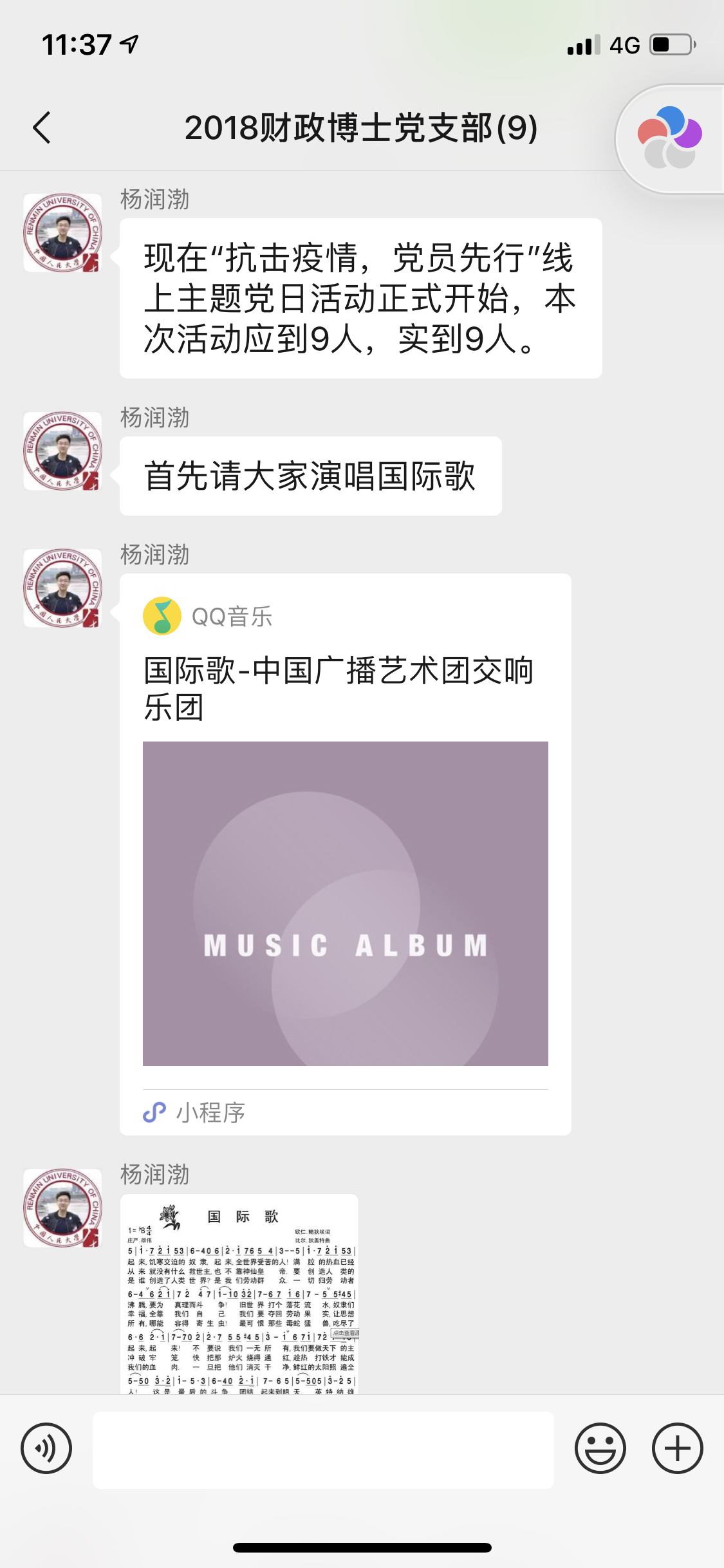 晚八点整,线上主题党日正式开始,全体党员高度重视,按时到位。活动第一项,全体演唱《国际歌》。伴随着庄严肃穆、激情澎湃的歌声,大家的激情瞬间被点燃,尽管不见面,这份热情依然隔着屏幕传递着。紧接着,杨润渤书记带领大家重温了这次新冠肺炎疫情蔓延的过程,尤其是各地如何精准施策坚决遏制疫情蔓延,还着重讲解了习近平总书记在此次疫情阻击战中的重要指示精神。正如习近平总书记所强调,“要再接再厉、英勇斗争,以更坚定的信心、更顽强的意志、更果断地措施,仅仅依靠人民群众,坚决把疫情扩散蔓延势头遏制住,坚决打赢疫情防控的人民战争、总体战、阻击战。”