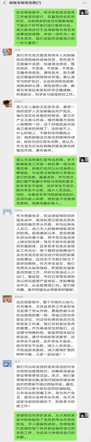 2020年2月12日晚,2018级保险专硕党支部响应学院党委号召,采用线上会议的方式,在支部微信群召开了“抗击疫情,党员先行”线上主题党日活动。本次线上主题党日由支部书记周安文同志主持,支部全体党员参与。