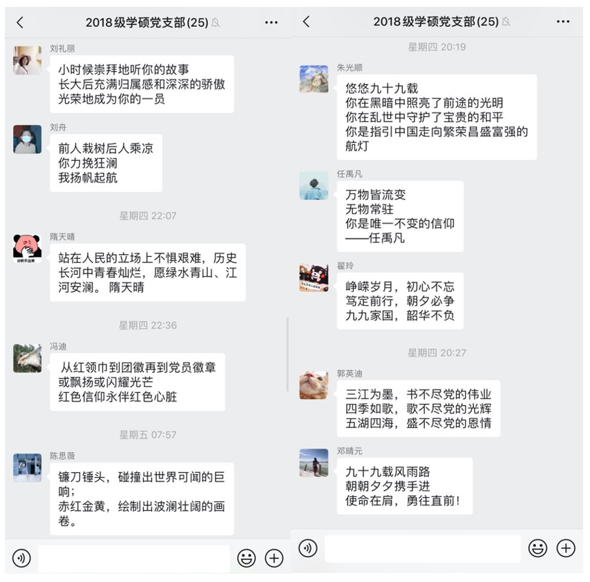 在此次主题党日中,2018级学硕党支部通过一系列活动,帮助支部成员从理论中学习、从生活中感悟;从自主研读中学习、从交流分享中进步。在理论学习时,支部成员们带着责任、带着问题阅读理论知识,深思细悟,研机析理,加深了理解和领会。在交流环节中,支部成员带着关切、带着诚心投入实践,观察生活,讲述了自己或身边的抗疫故事和深切体会,更加明确了何为担当和责任。在手写情书时,支部成员们带着敬意、带着热爱,执笔抒发对党的深情,三行情书献礼党的九十九载华章壮阔!