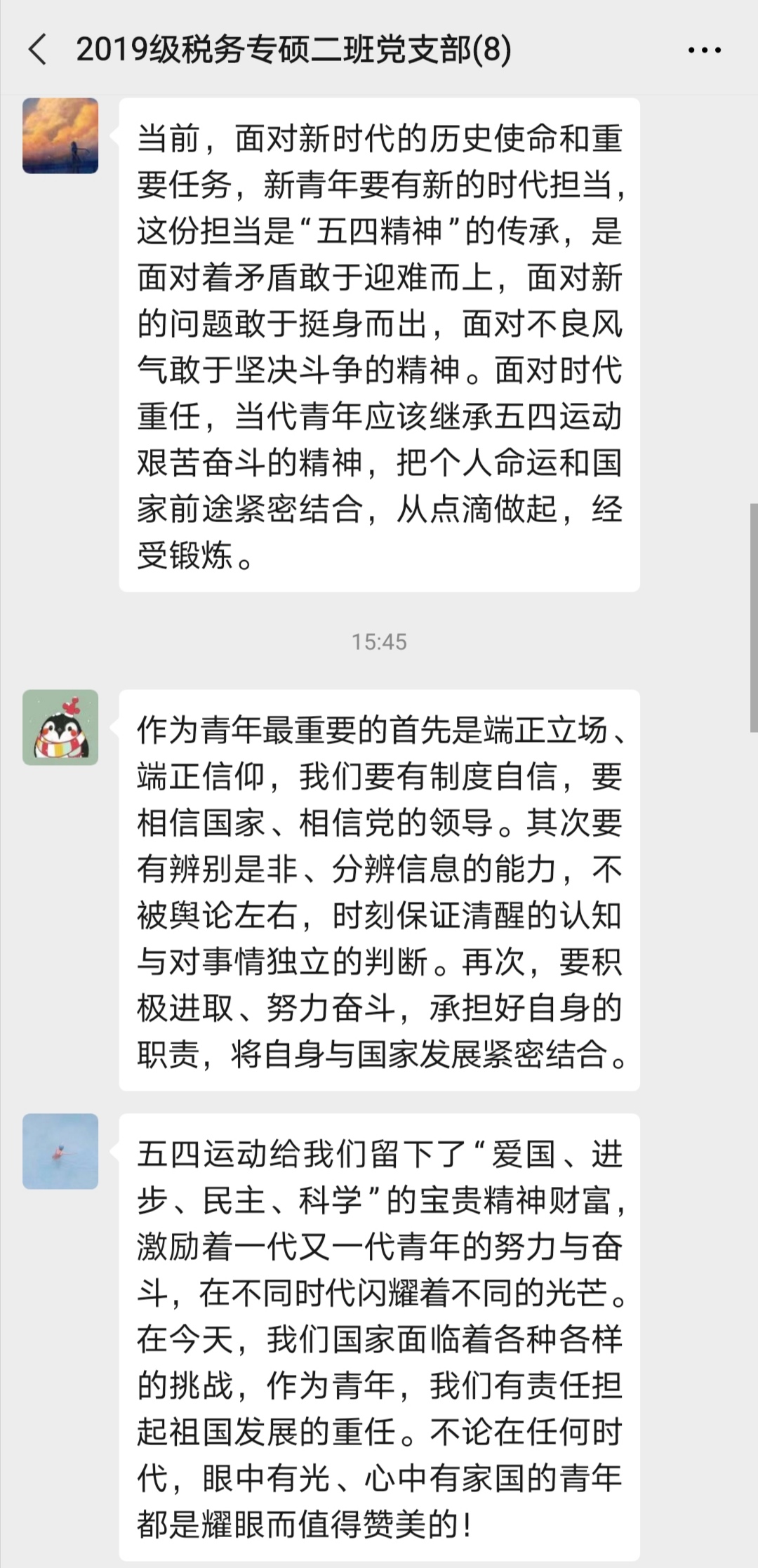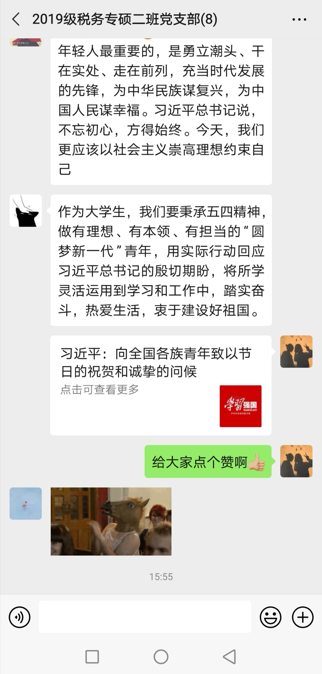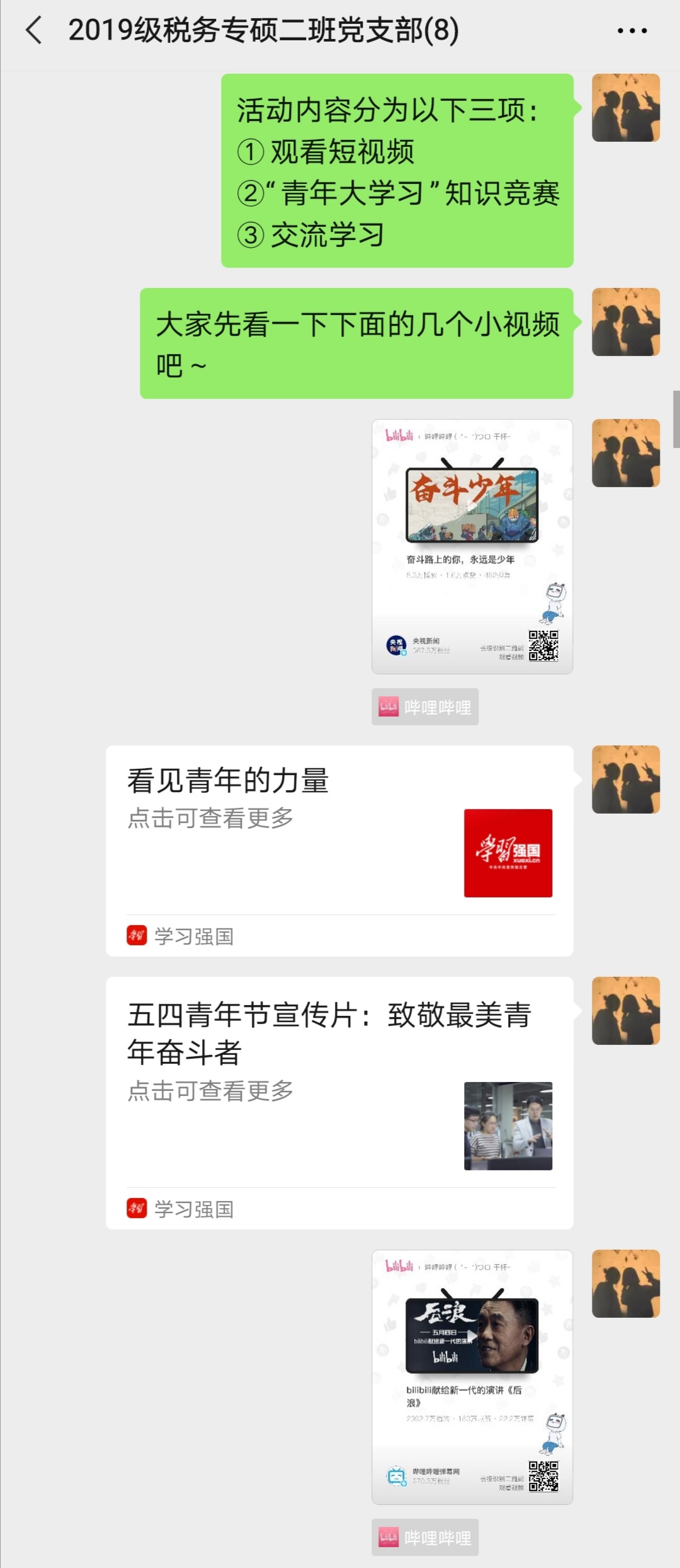 2020年5月13日下午15点,2019级税务专硕二班党支部运用了微信群、B站、学习强国等新媒体辅助开展了5月“弘扬五四精神”线上主题党日活动。此次活动由党支部书记马国焕同志主持召开,会议内容分为观看“奋斗路上的你,永远是少年”、“看见青年的力量”等短视频、“青年大学习”知识竞赛、交流体会三个流程。