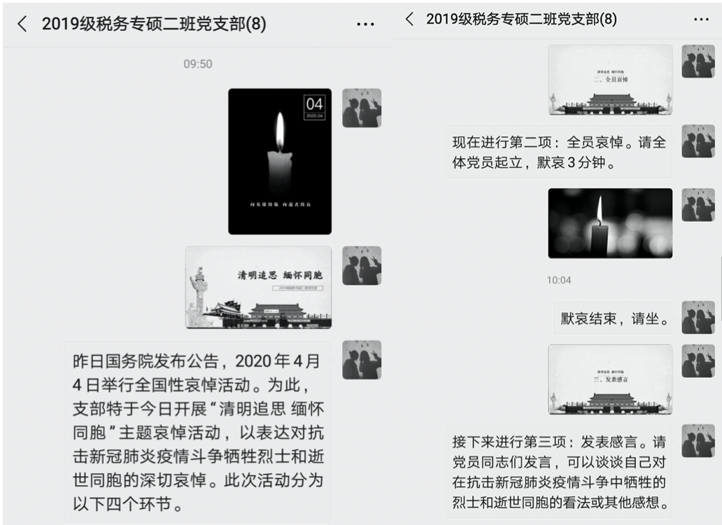 2020年4月3日,国务院发布公告,宣布4月4日举行全国性哀悼活动:在此期间,全国和驻外使领馆下半旗志哀,全国停止公共娱乐活动。4月4日上午10时,2019级税务专硕二班党支部通过微信群等平台召开了“清明追思,缅怀同胞”主题悼念活动。活动由党支部书记马国焕同志主持,表达了对抗击新冠肺炎疫情斗争牺牲烈士和逝世同胞的深切哀悼。