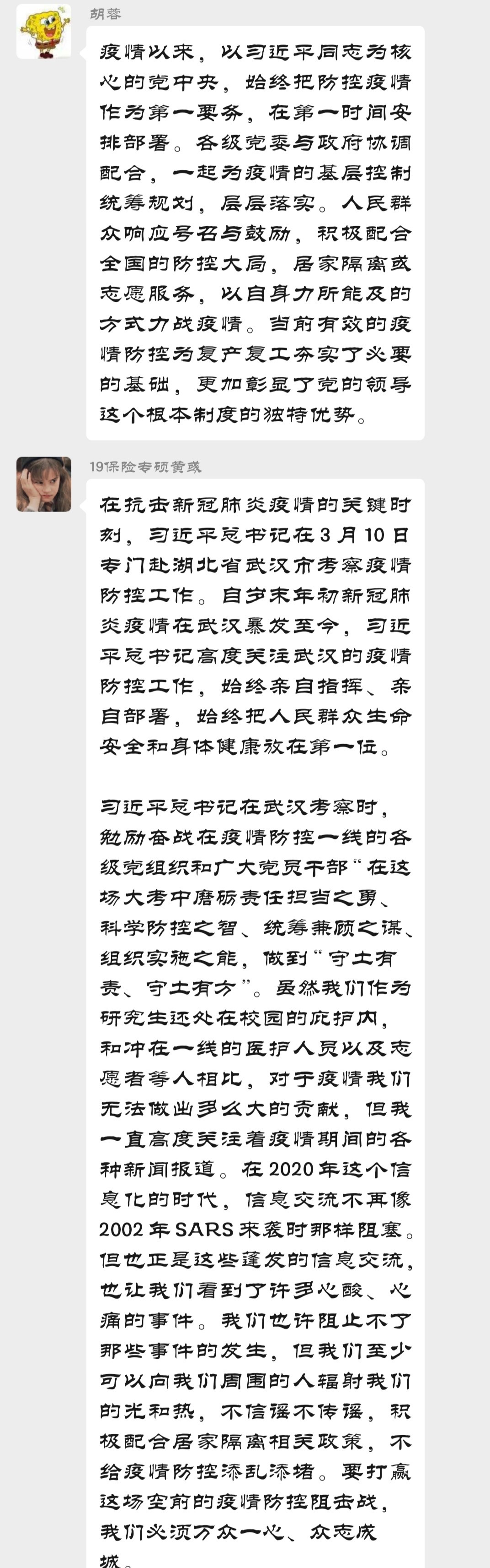 为更好地学习疫情防控相关知识,发挥广大党员在疫情防控阻击战中的先锋模范作用,2019级保险专硕党支部于3月12日晚8点在支部微信群开展“画好共同抗疫情的同心圆”3月线上主题党日活动。全体党员和积极分子签到、参与学习并进行了积极讨论,在抗击疫情的决胜时期,大家认真学习了习近平总书记在湖北考察时的讲话,并结合抗疫公开课和身边的抗疫故事分享了自己的心得体会。