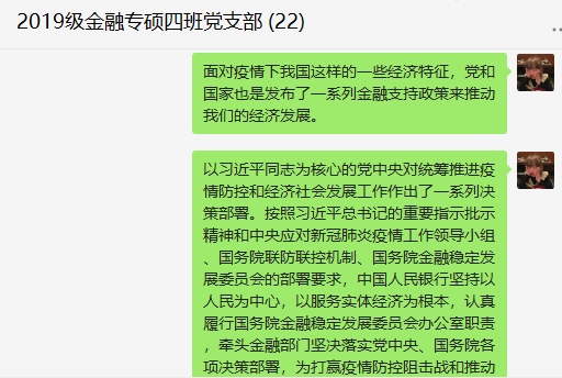 7月15日晚8点,2019级金融专硕四班党支部以微信群聊的方式开展“讲战疫故事,悟初心使命——谈谈疫情下党和国家助力经济发展的金融支持政策”党日活动,活动由党支部书记梁卓敏主持,支部全体党员和积极分子参与了本次活动。