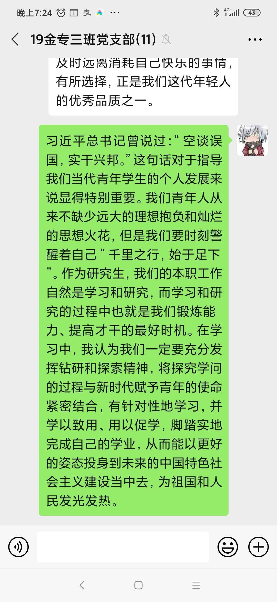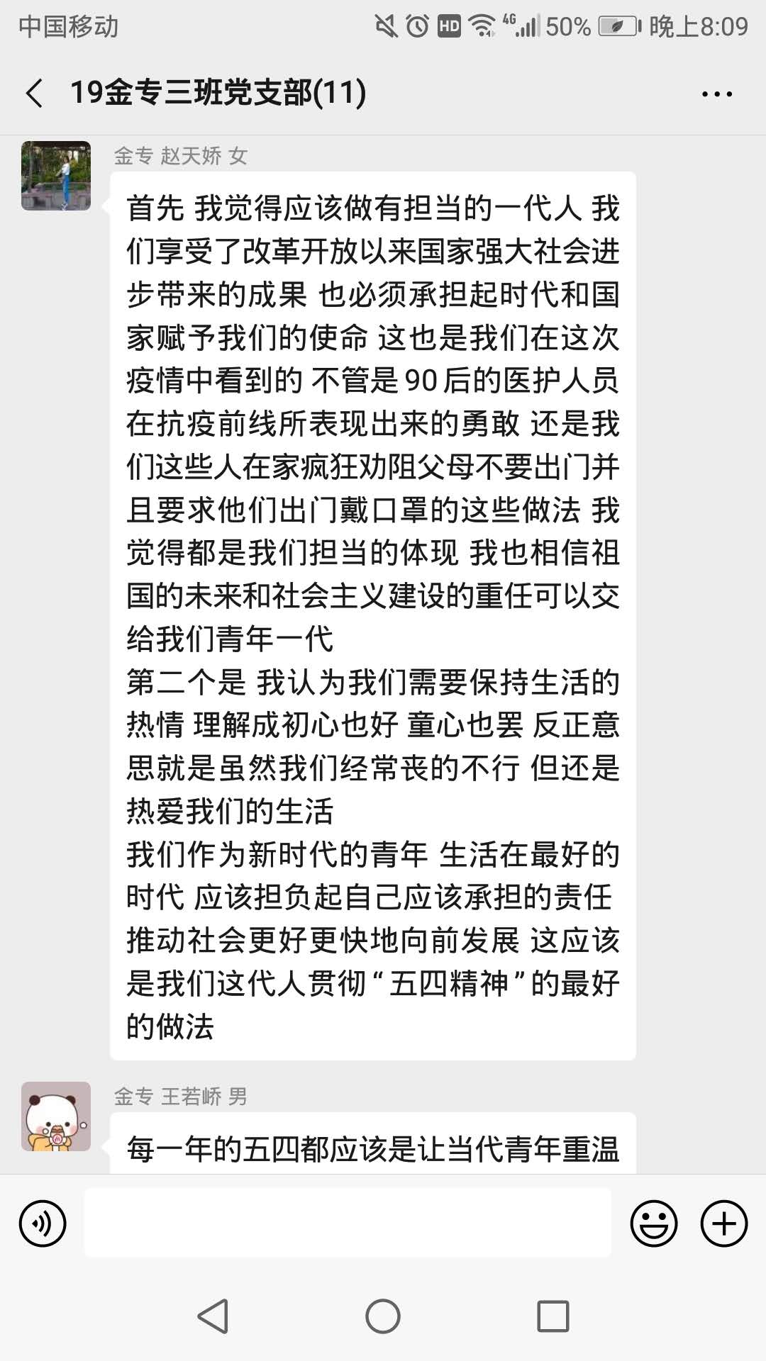 2020年5月16日晚7点,2019级金融专硕三班党支部在微信群中以线上讨论的方式举办了主题为“弘扬五四精神”的5月主题党日活动,本次活动共有11名正式党员参加。