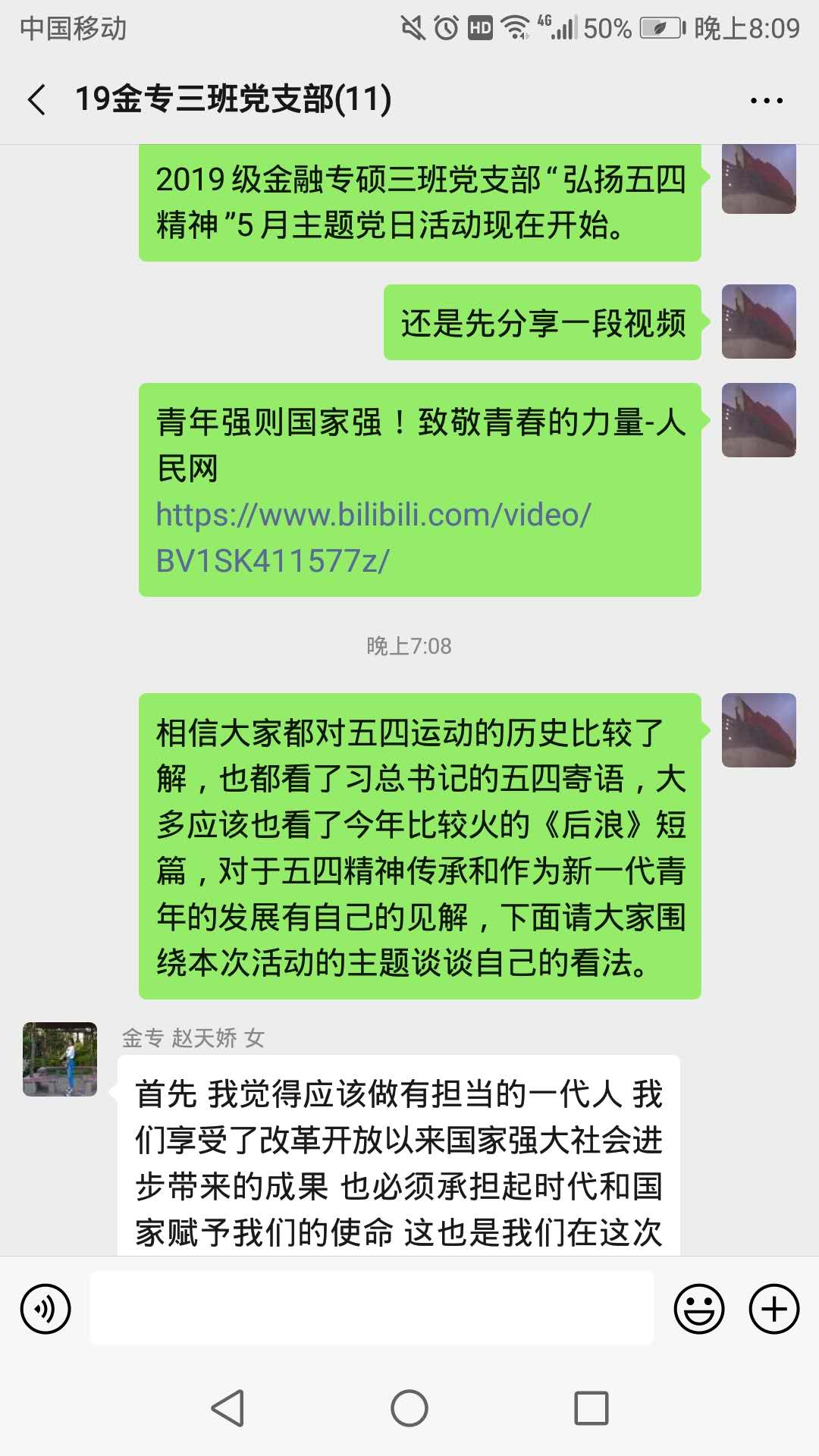 线上主题党日 | 2019级金融专硕三班党支部分享五四视频,讨论青年责任担当