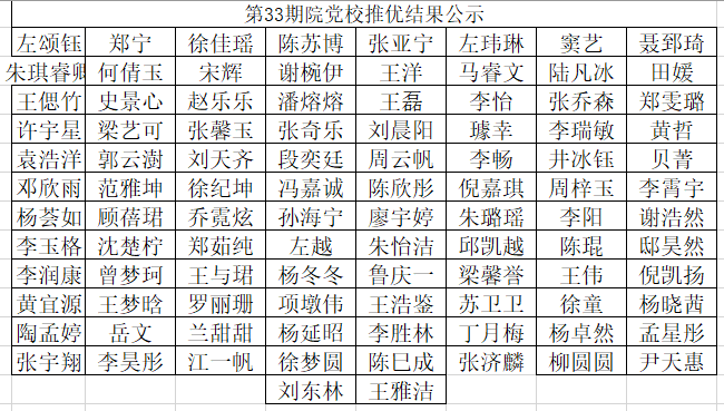 学院党委在充分尊重各支部推荐意见的同时,根据院党校通知中的相关要求,对符合推荐资格的同学进行筛选。现对拟参加学院第33期院党校积极分子培训班的63名同学进行公示,以听取党内外群众意见。