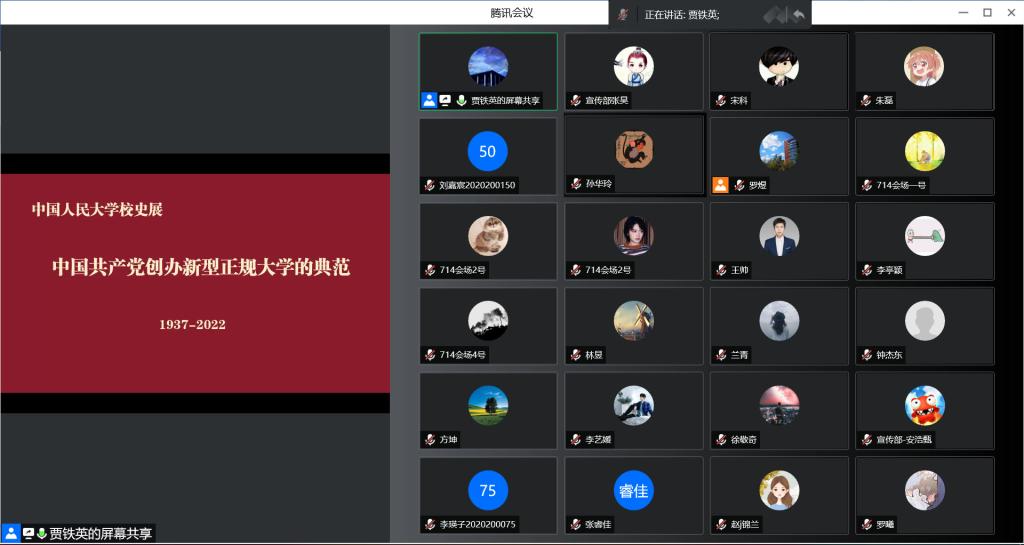 2022年6月29日晚,Top 网上赌博网站大全 党委通过腾讯会议平台组织开展云参观“中国人民大学校史展:中国共产党创办新型正规大学的典范”活动暨预备党员宣誓仪式。活动特邀中国人民大学博物馆馆长贾铁英进行讲解。本次活动由学院党委副书记罗煜主持,学院党委理论学习中心组全体成员、53名预备党员参与活动。
