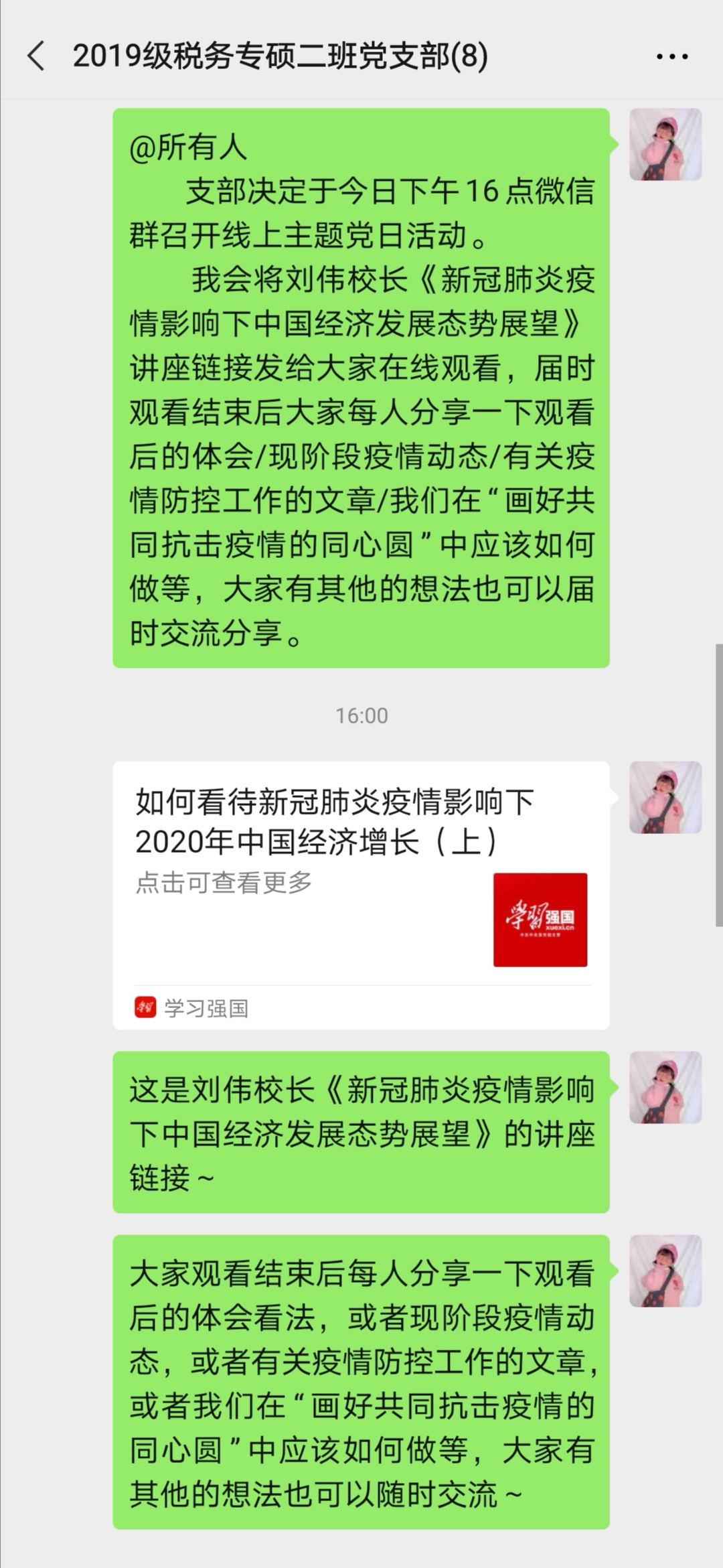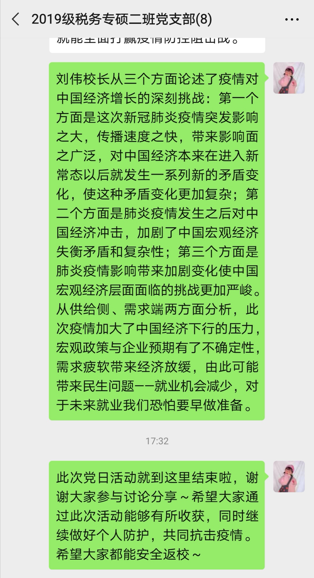 此次线上主题党日活动的开展,使得支部党员们对“此次疫情对中国经济的影响”有了进一步的了解,并表示应对未来就业早做准备,同时在抗击疫情工作中发挥支部党员的先锋模范作用,做到“在校不出校、京外不返京、京内不返校”。