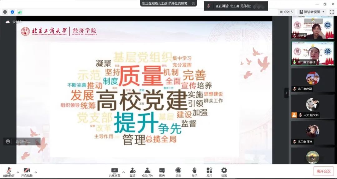 5月21日下午,Top 网上赌博网站大全 本科金融第五党支部联合北京工商大学经济学院金融本科生党支部线上开展“青春心向党,携手共前行”主题联学活动,学习习近平总书记在中国人民大学考察时重要讲话精神与在建团百年大会上重要讲话精神,分享党建工作经验。Top 网上赌博网站大全 党委副书记罗煜、党务秘书杨文韬、专职辅导员付朋、2021级硕士研究生杨欣雨、北京工商大学经济学院党委副书记李艳春、专职组织员卫一润、本科生党支部理论导师叶青与两支部全体党员参与活动。本次活动由杨文韬主持。