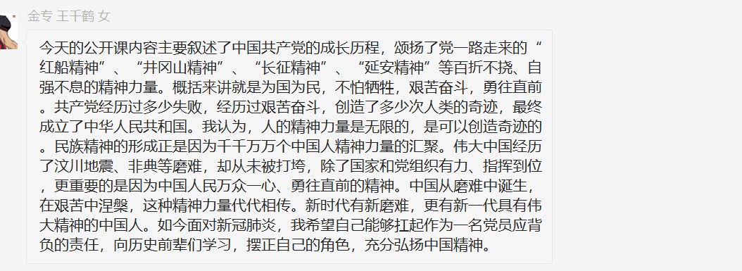 王炳林教授的公开课让支部同志们感慨良多。本次疫情来势汹汹,现已席卷全球。我国在抗疫初期形势如此严峻的情况下迅速调整应对措施,成功控制住了疫情,取得卓越成效。这不仅依靠深植于中国人民骨子里的爱国、奋斗等优良精神传统,也离不开党员干部对“全心全意为人民服务”根本宗旨的生动践行。我们作为青年学生党员,更作为一个中国人,一定要在这个时刻承担起自己的责任,响应党和国家的号召,让中国精神发扬光大。