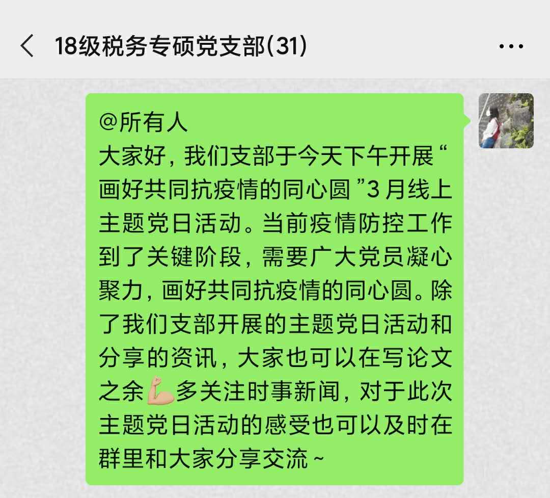 当前正值新型冠状病毒感染的肺炎疫情防控关键时期,为更好发挥基层党组织战斗堡垒作用,切实动员广大党员在疫情防控阻击战中作表率争先锋,3月14日下午,2018级税务专硕党支部开展了“画好共同抗击疫情的同心圆”3月线上主题党日活动。此次活动由党支部书记沈小米主持,全体党员积极参与其中。本次活动通过权威微信公众号、“学习强国”APP等新媒体渠道进行学习,以同学们分享个人感受为主要方式组织开展。
