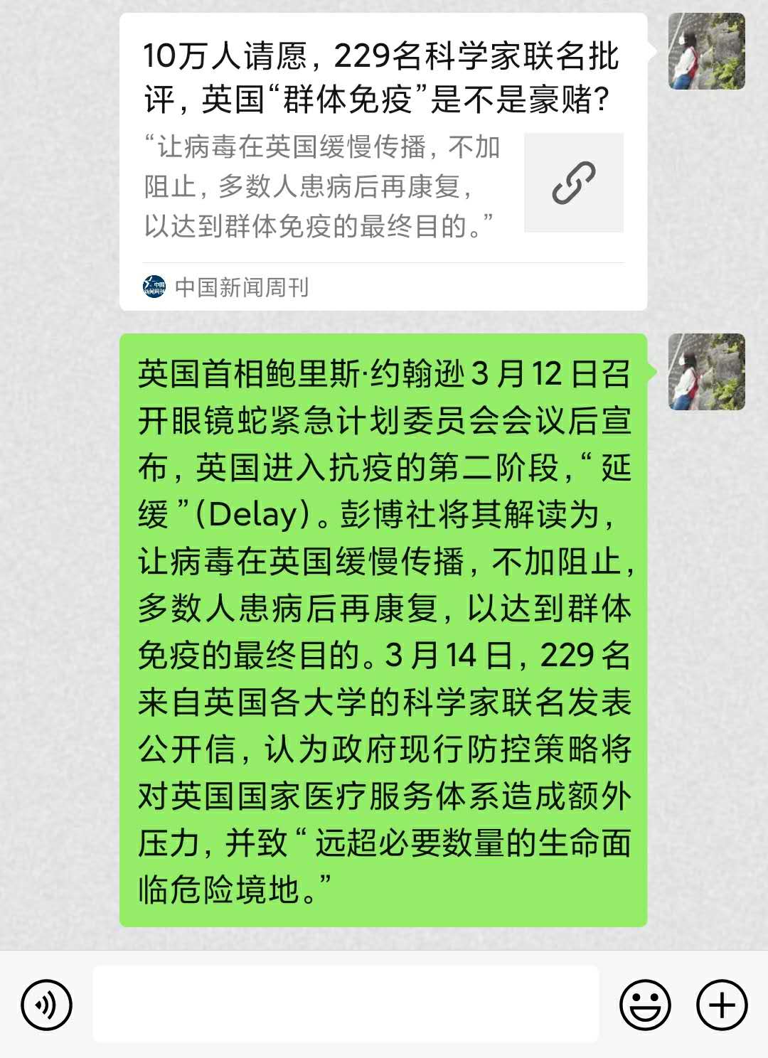 视频观看结束后,主持人向大家分享了当前全球疫情资讯,英国进入抗疫的第二阶段——“延缓”,彭博社将其解读为,让病毒在英国缓慢传播,不加阻止,多数人患病后再康复,以达到群体免疫的最终目的。3月14日,229名来自英国各大学的科学家联名发表公开信进行反对,认为政府现行防控策略将对英国国家医疗服务体系造成额外压力,并致远超必要数量的生命面临危险境地。