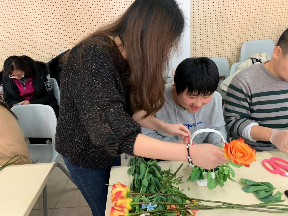 手工活动组的成员们在公益授课老师的指导下,陪伴、帮助自闭症儿童进行插花学习,并完成了花篮的制作。这些自闭症孩子大多在15-20岁之间。与影视剧中不同的是,他们完全具有交流与表达能力,只是认知较普通人有一些缓慢。参与活动的马国焕同志分享了她的感受:“这里的孩子们虽然心智很低,脸上总是洋溢着最纯真和最真挚的表情。看到一个个折翼的小天使脸上天真灿烂的笑容,我们也感觉特别幸福。真心希望这群孩子能够健康成长,飞向高空,走向未来。送人玫瑰,手有余香。对于党员而言,志愿帮扶就是奉献社会。我们参与志愿工作,牢记全心全意为人民服务的宗旨,为社会出力,尽一份公民的责任和义务。很感谢这次志愿活动让我们走进夜空中散落的小星星,帮助了那些缺乏温暖的人,给予他们温暖的关怀,而我们自己也在这些帮扶活动中深刻体会到作为党员的责任与义务。”