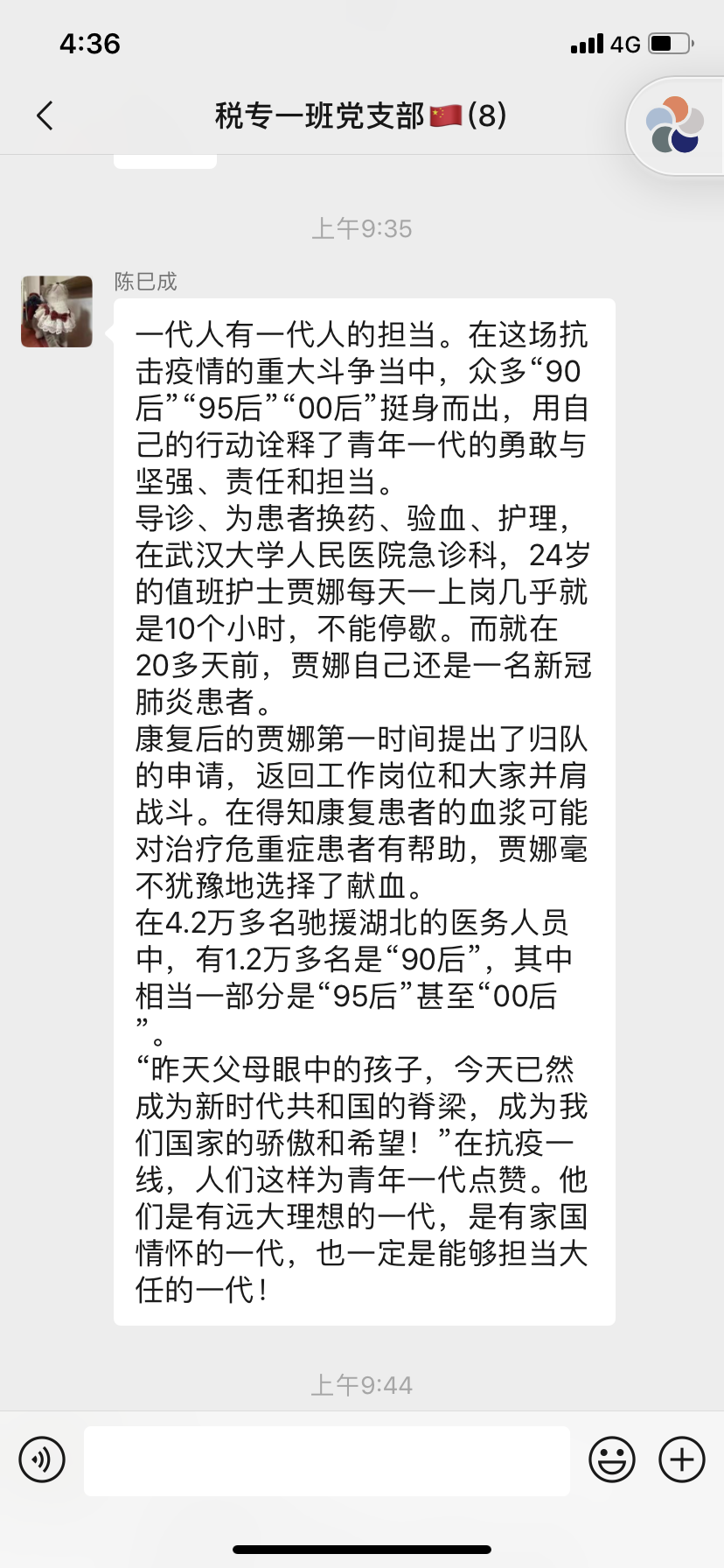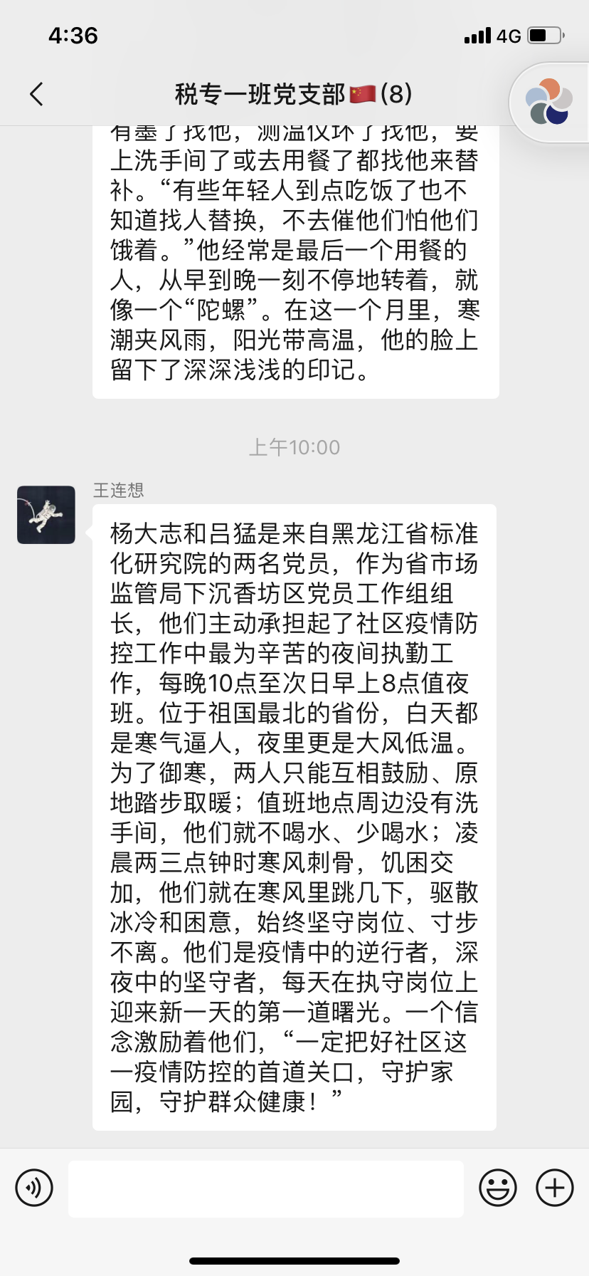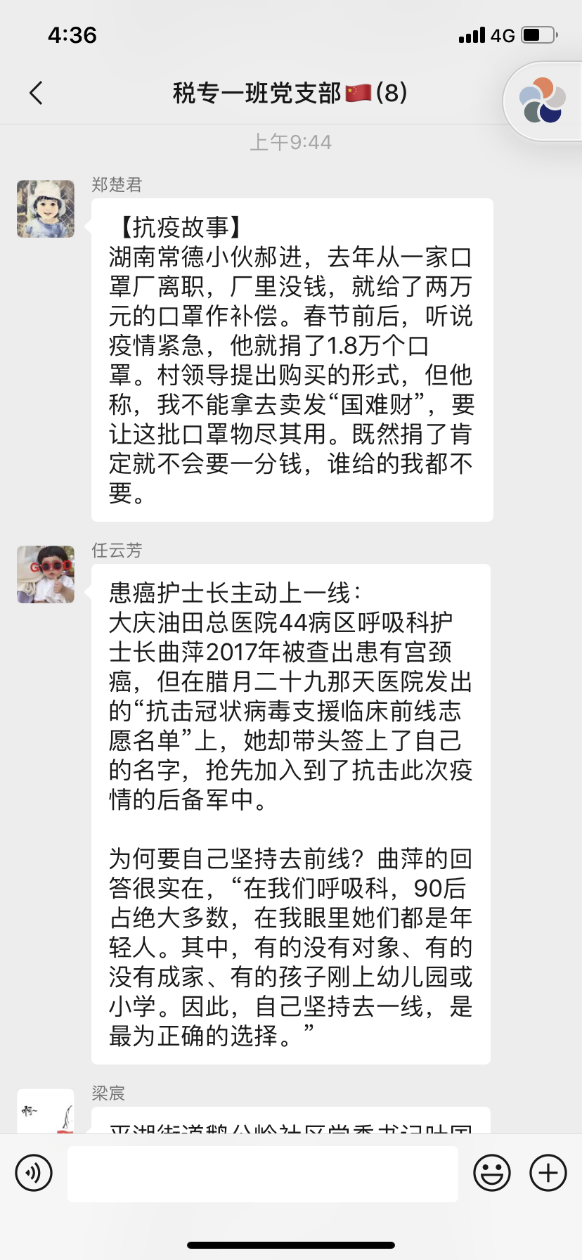 本次主题党日活动的第一部分为支部“线上抗疫英雄事迹分享”。通过支部成员每人在微信群中分享身边的或关注到的抗疫英雄事迹,我们将目光聚集在这群可爱又伟大的英雄身上。任云芳同志分享了大庆油田总医院44病区呼吸科护士长曲萍的事迹:作为一名在2017年被查出患有宫颈癌的女护士,在腊月二十九那天医院发出的“抗击冠状病毒支援临床前线志愿名单”上,她毅然决然地带头签上了自己的名字,抢先加入到了抗击此次疫情的后备军中。抗疫路上,有自掏腰包为一线工作人员买口罩的党委书记,有无畏风险争当检疫人员的退伍军人,还有在夜间执勤的社区党员。这些奋战在抗疫一线的不惧牺牲、奉献自我的抗疫英雄们,是我们学习与致敬的榜样。