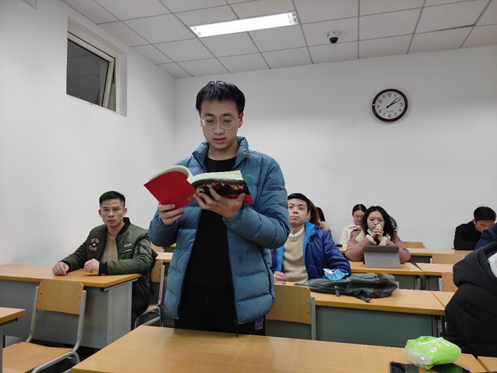 在发言环节朗读《习近平与大学生朋友们》一书的穆玉浩同志表示,习近平总书记在国科大的时候,寄语大学生们“我们比历史上任何一个时期都更接近中华民族伟大复兴的目标”。他强调,我们处在一个伟大的时代,有着国家提供的无与伦比的好的学习条件 ,应该牢记习近平总书记的嘱托,脚踏实地,在研究生阶段踏踏实实的学习,沉下心来做研究,把个人理想融入中华民族的伟大复兴的中国梦当中。
