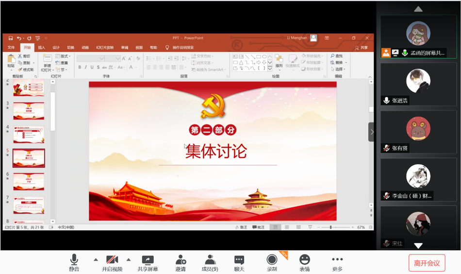 在接下来的集体讨论中,各位党员和积极分子发表了微党课学习的心得体会,并讲述了自己身边的抗疫故事,分享了自己的切身体会。在这次的线上讨论中,大家各抒己见,同学们都从这次疫情中,感受到了党员带头的先锋模范作用。有同学表示应该在今后的学习工作中,身体力行地 “让青春在党和人民最需要的地方绽放绚丽之花”,不负党和人民的期望。有的同学表示取得群众的理解是基层防控工作顺利进行的保证。大家积极参与,热情分享,畅所欲言,随着讨论的逐渐深入,气氛也逐渐达到了高潮。