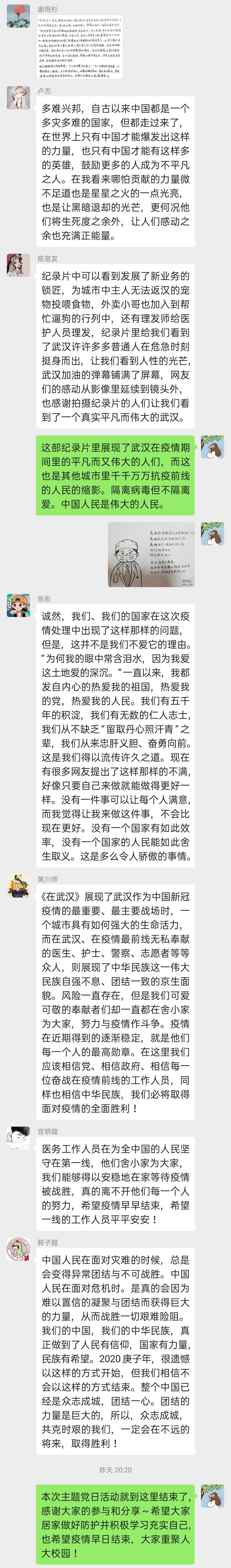 首先,本支部组织党员观看《在武汉》三集纪录片,通过纪录片看到疫情一线各行各业普普通通的人们在危机时刻挺身而出,以此向他们致敬。随后,支部党员们分享了自己的心得体会。